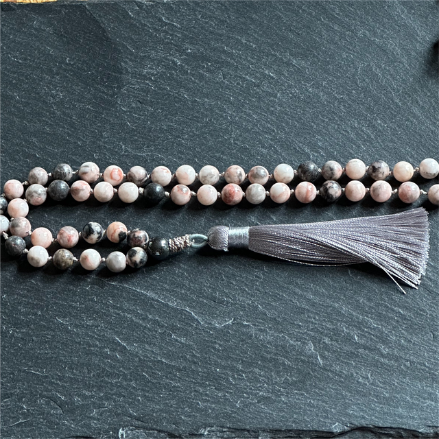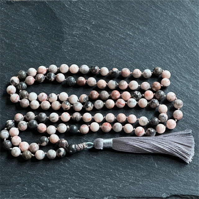 Hand-made, hand knotted with 108 gemstone beads finished with a silver grey tassel. Traditionally used as prayer beads or for meditation with mantras to enhance spiritual connection. This beautiful necklace combines the healing properties of Jasper and the power of prayer.