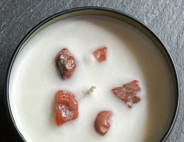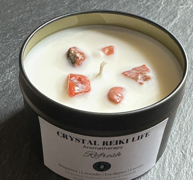 Hand poured with soy wax and Bergamot, Eucalyptus (Chinese), Lavender and Lemon essential oils and infused with Carnelian crystals and Reiki energy.