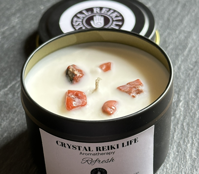 Hand poured, small batch made with soy wax and essential oils infused with Reiki and Crystal energy.