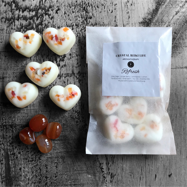 Hand poured with soy wax and Bergamot, Eucalyptus (Chinese), Lavender and Lemon essential oils and infused with Carnelian crystals and Reiki energy.